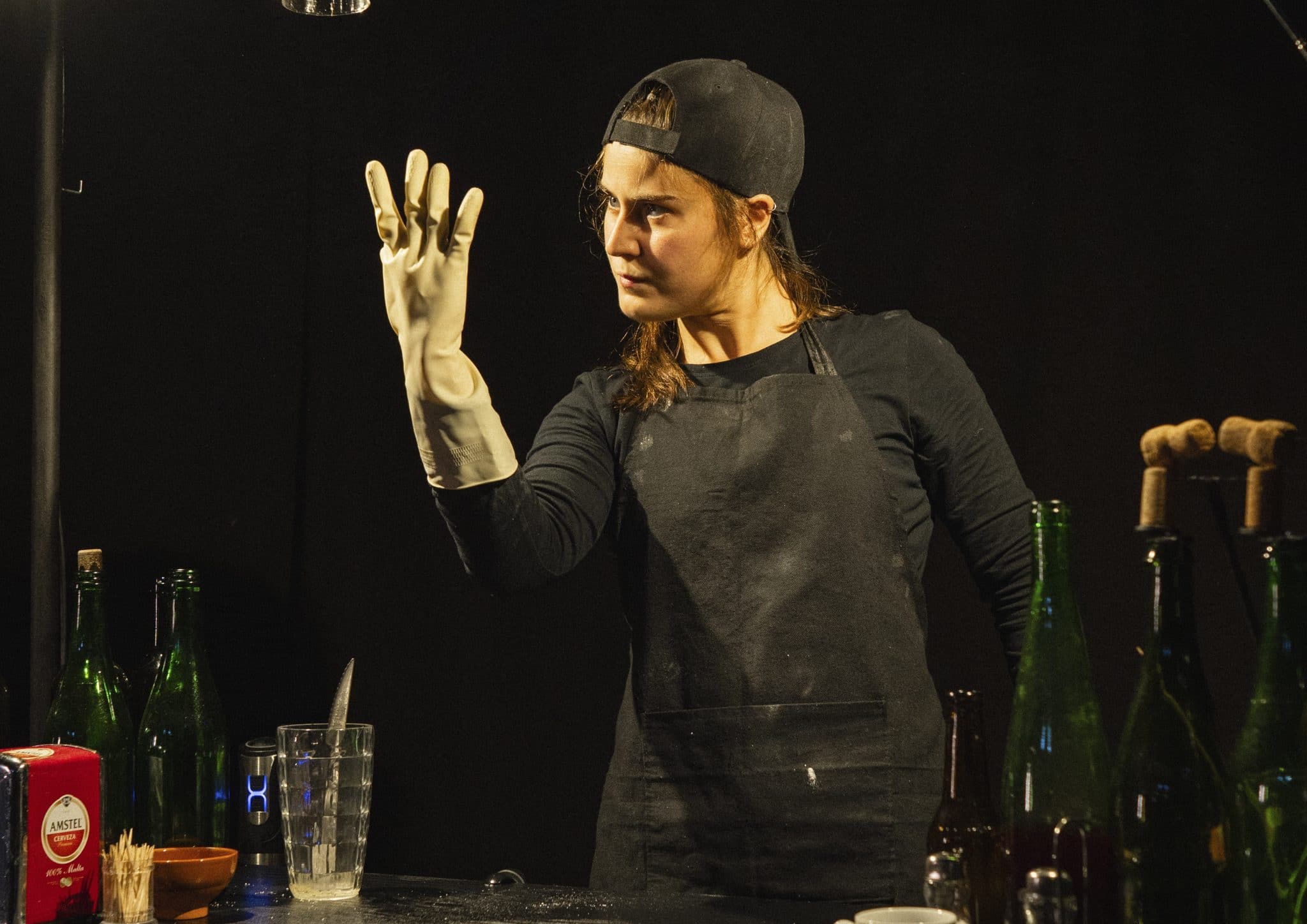 “Gracias por su visita” transcorre integramente nese bar no que todo cobra vida: estropallos, copas, ananás e tapóns transfórmanse en criaturas míticas, mentres a camareira devén deusa e xogamos co límite entre o real e o soñado, entre o meme e o mito. A creación pon en valor o teatro de obxectos e reinventa o relato universal dende a mitificación do cotián, nese territorio onde a decadencia lle dá a man ao divino.
